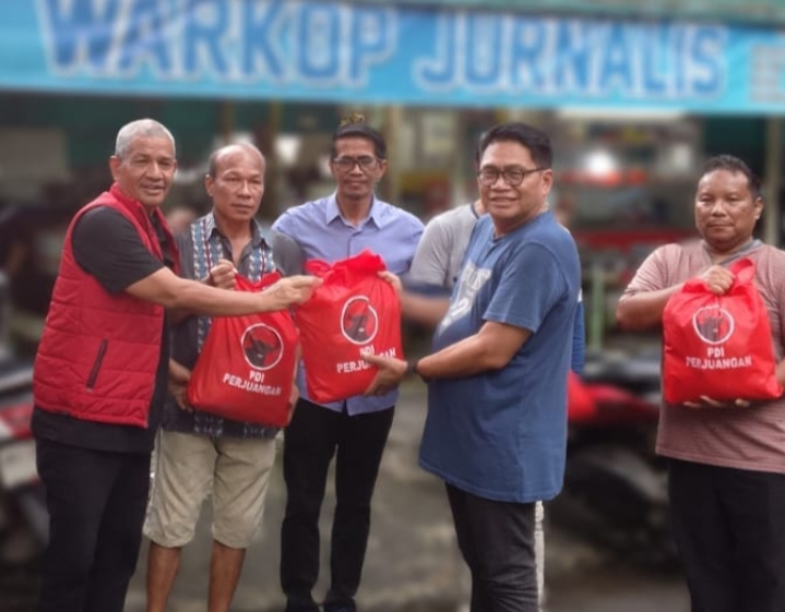 Penyerahan bantuan kepada wartawan terdampak banjir dari Sekretaris DPD PDI P Sumut Dr Sutarto, Sabtu (6/12) di Warkop Jurnalis Medan.(ist)