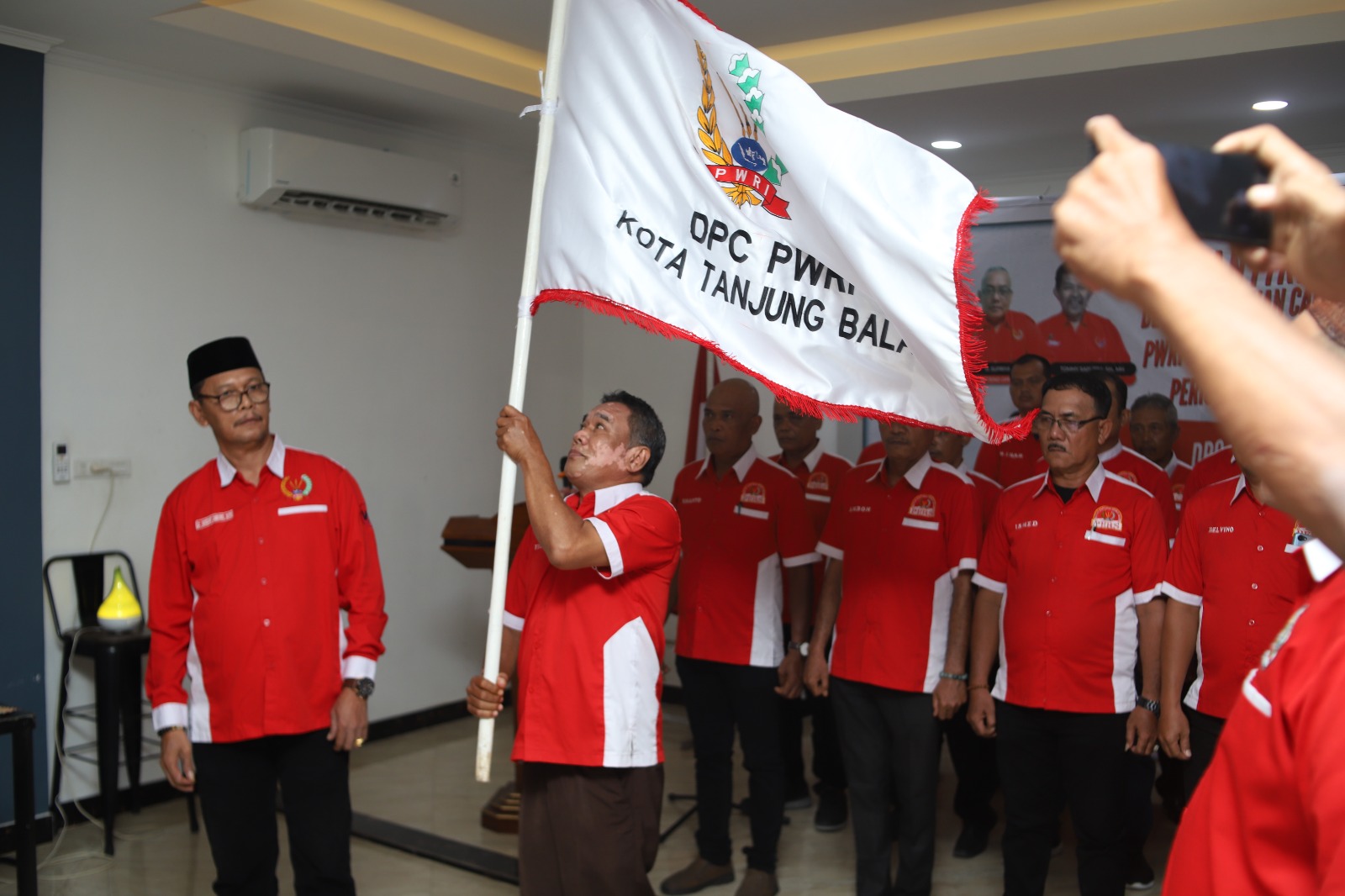 Saat pelantikan berlangsung, Ketua DPD PWRI Sumut Dr. Masdar Limbong, M.Pd menyerahkan bendera Pataka kepada Ketua PWRI Kota Tanjung Balai Yusman, disaksikan pengurus DPC PWRI Kota Medan, DPC PWRI Kota Tebing Tinggi serta seluruh peserta yang hadir.