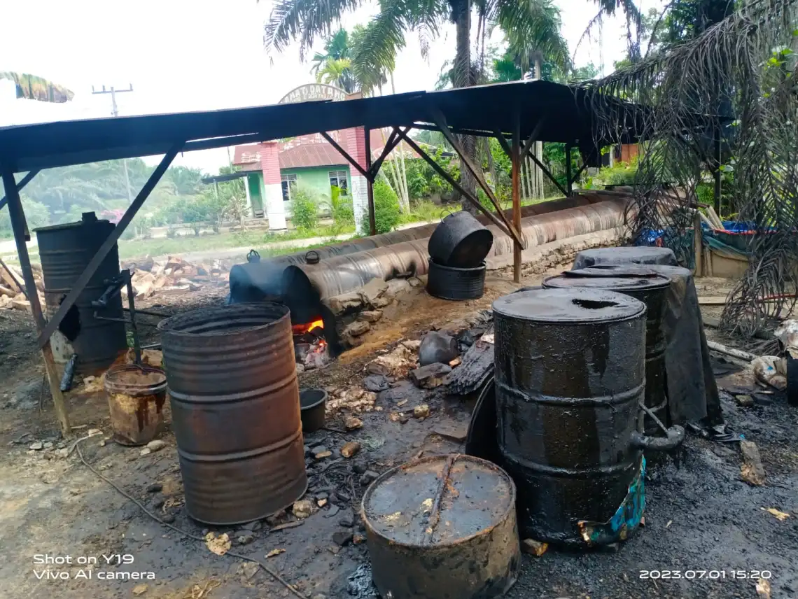“Sekali masak menggunakan 3 bong (alat penyulingan) dengan 4 sambungan drum tiap bongnya. Tiap hari dapat menyuling sedikitnya 2 ton condensat,” tutur warga, sembari meminta hak tolaknya, Selasa (4/7/2023) siang.