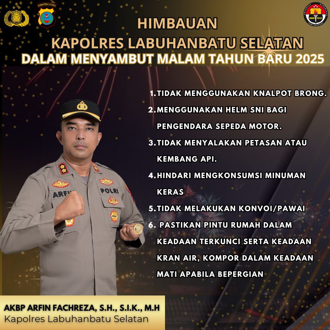 LABUSEL, INVOCAVIT.COM – Kapolres Labuhanbatu Selatan (Labusel), AKBP Arfin Fachreza mengimbau seluruh pengendara kendaraan bermotor agar tidak menggunakan knalpot bising pada perayaan malam pergantian tahun 2025.