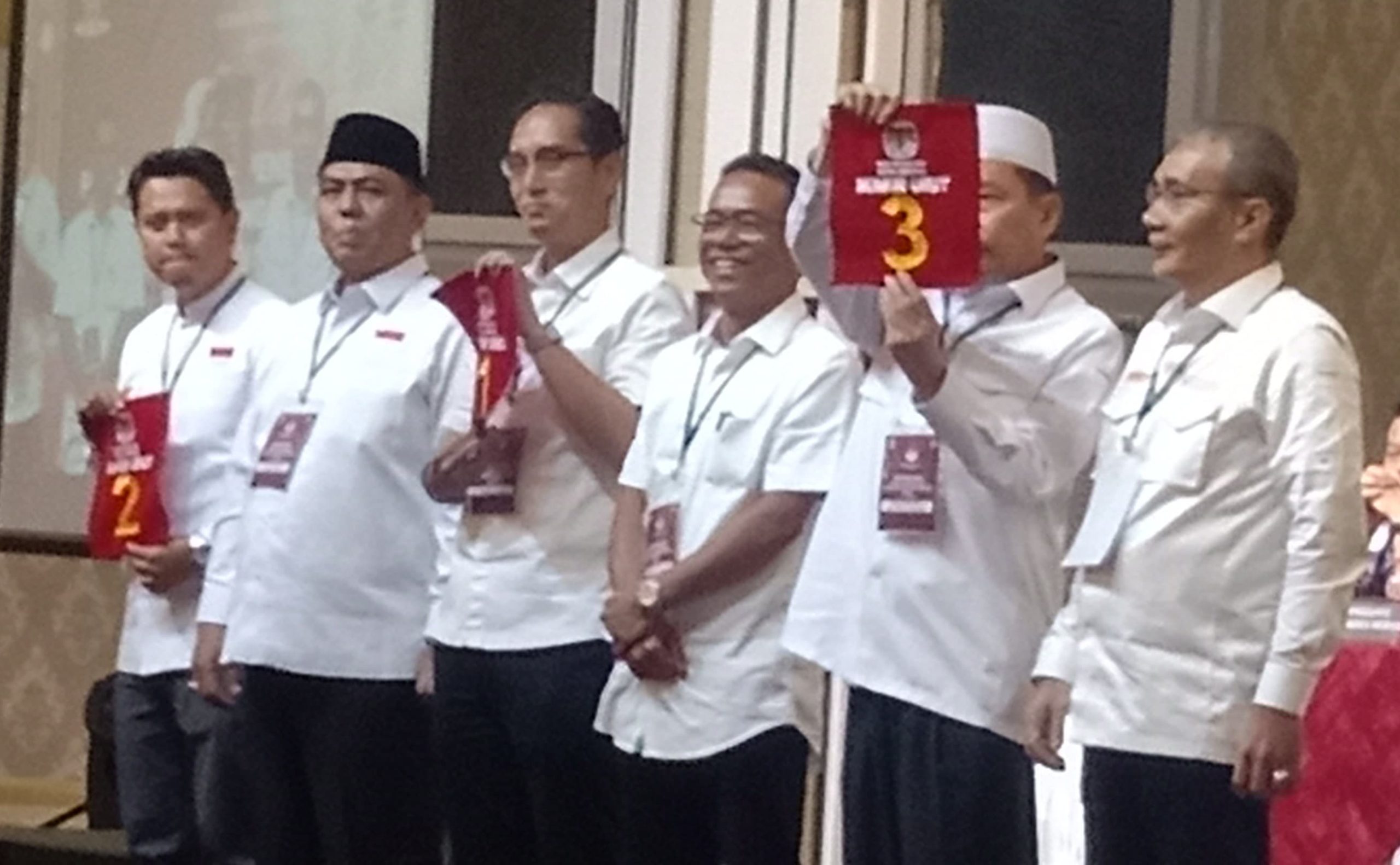 Setelah pengambilan nomor urut tersebut, Prof Ridha Dharmajaya-Abdul Rani memperoleh nomor urut 2. Lalu, Rico Tri Putra Bayu Waas dan Zakiyuddin Harahap nomor urut 1 dan Hidayatullah -Yasyir Ridho Loebis nomor urut 3.(rel).