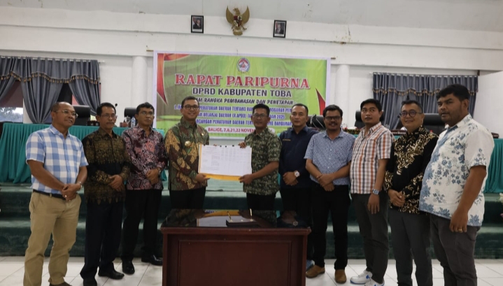 TOBA, INVOCAVIT.COM – DPRD Kabupaten Toba bersama Penjabat (Pjs) Bupati Toba, Dr. Agustinus Panjaitan, resmi menandatangani persetujuan bersama terkait Rancangan Anggaran Pendapatan dan Belanja Daerah (RAPBD) Tahun Anggaran 2025 serta Rancangan Peraturan Daerah (Ranperda) tentang Gedung dan Bangunan. Penandatanganan ini dilakukan dalam rapat paripurna di Gedung DPRD Toba, Kamis (21/11).