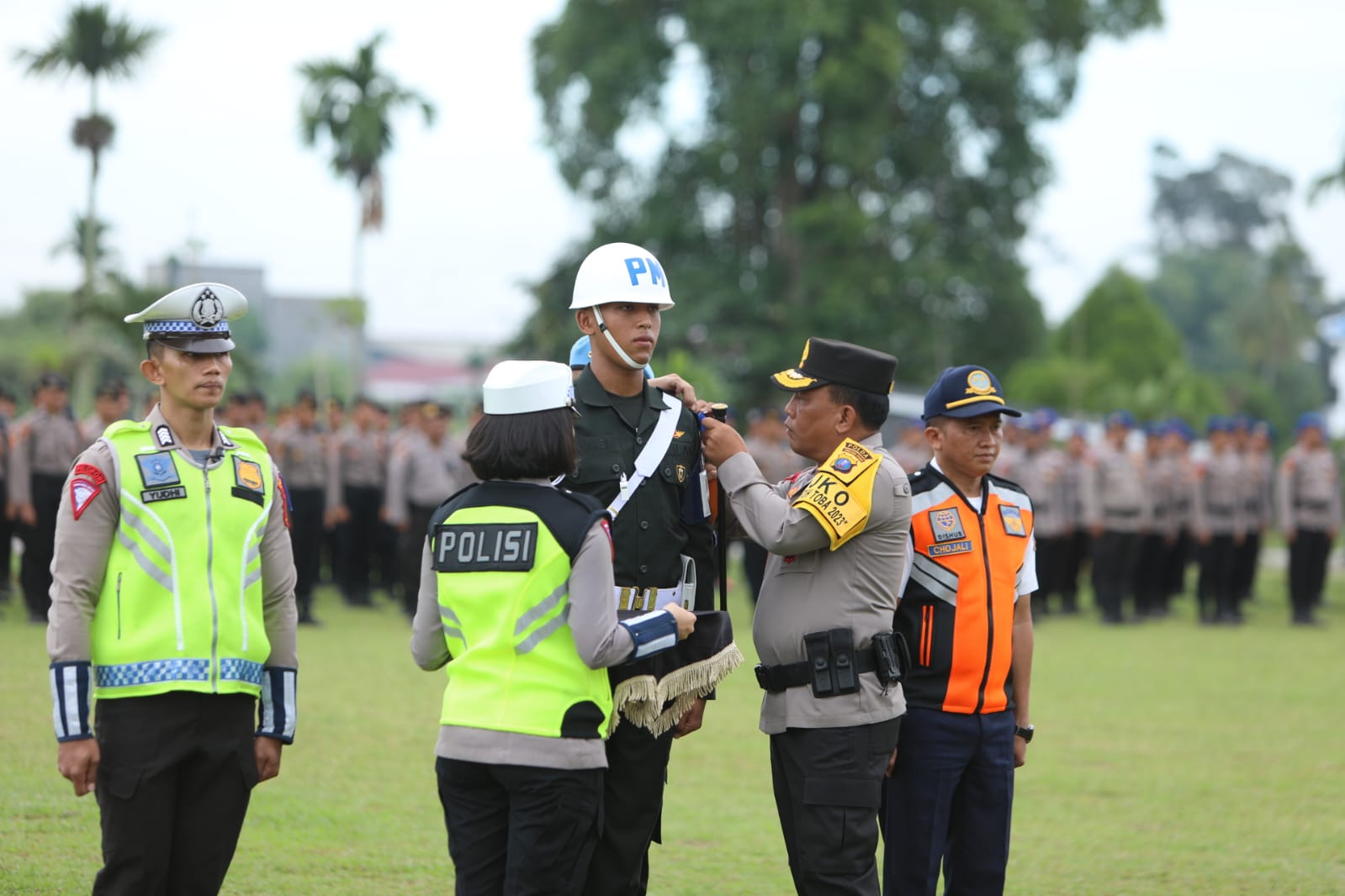 Kapolda Sumatera Irjen Pol Panca Putra Simanjuntak menyamarkan pita kepada personil tanda dimulainya Operasi Patuh Toba 2023 di Lapangan Bola Mapolda Sumut, Senin (10/7/2023). (Ist)