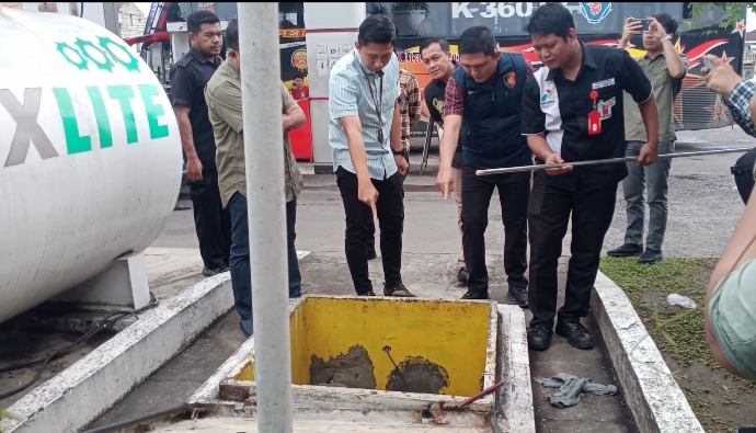 Kasubdit Tipidter Dit Reskrimsus Polda Sumut, AKBP M Alan Haikel melakukan pengecekan kadar BBM bersama Sales Branch Manager Medan Pertamina Patra Niaga Sumbagut, Devian Faris Hidayat langsung ke tangki penampungan di SPBU Jalan SM Raja Medan, Kamis (27/2/2025).(jostambunan).