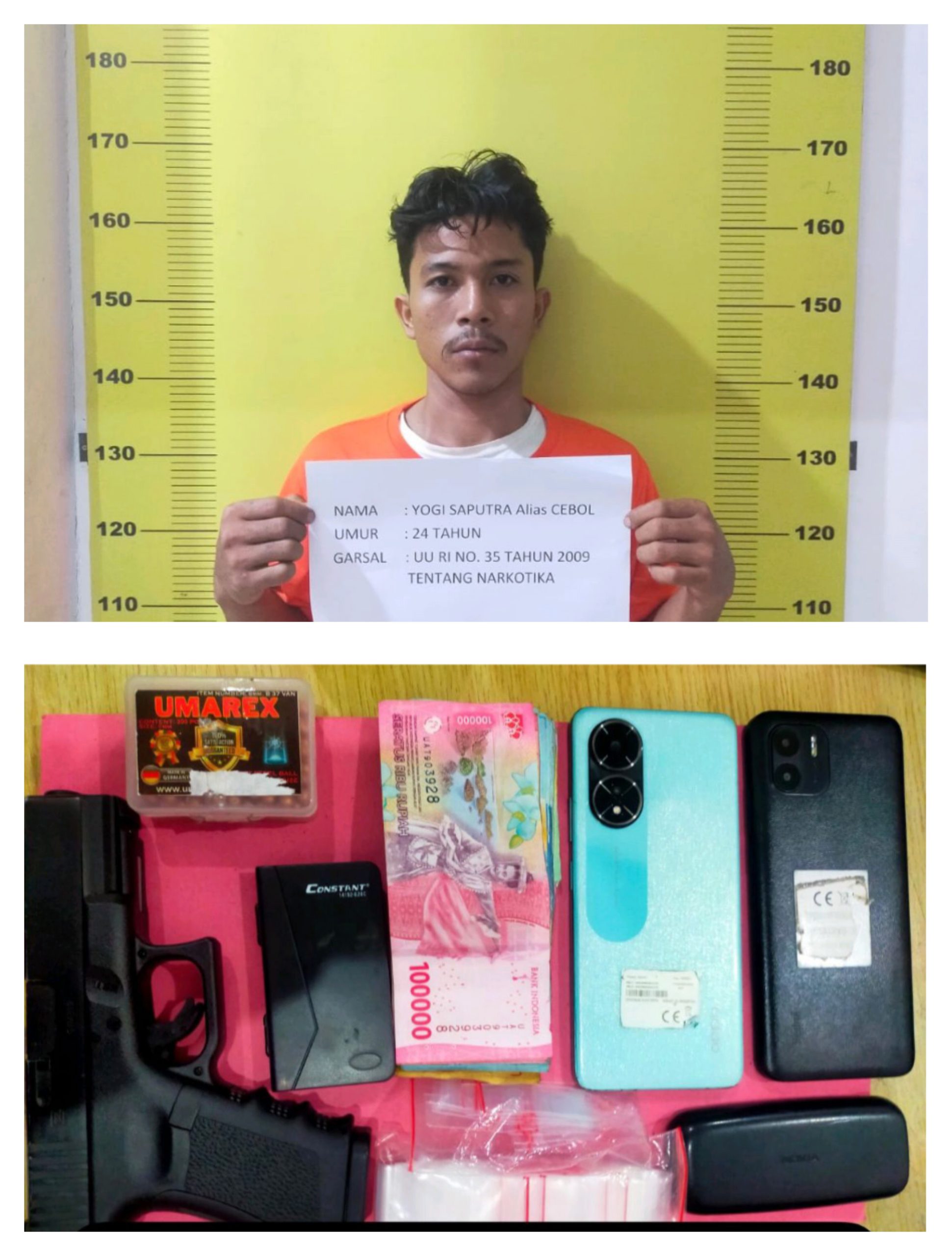 Hasilnya, ditemukan barang bukti, 1 timbangan electrik, 3 handphone (HP), uang tunai Rp 1.900.000, 1 plastik klip kosong dan 1 pucuk Reflika senjata Air Softgun jenis Glock 19 dan 1 kotak peluru.