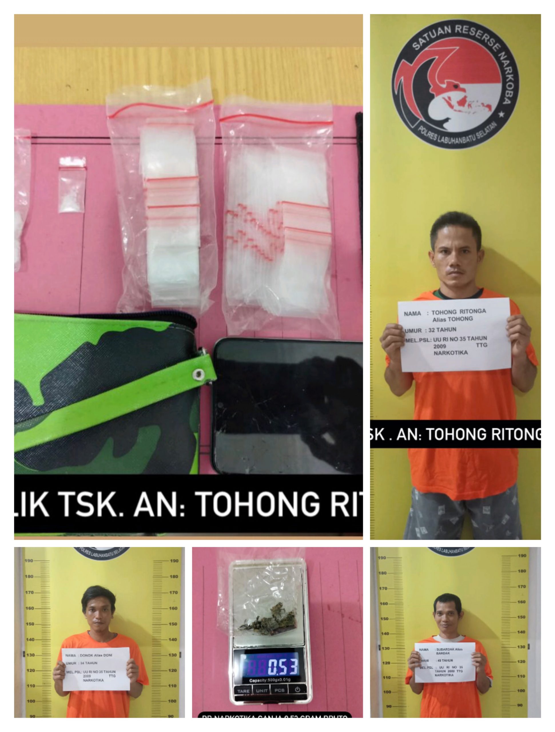 Satuan Reserse Narkoba Polres Labusel juga meringkus seorang pengedar sabu, Tohong Ritonga (37), warga Dusun Suka Jadi, Kelurahan Sabungan, Kecamatan Sungai Kanan, Labusel, di sekitar kediamannya, Kamis (7/3/2024) malam.