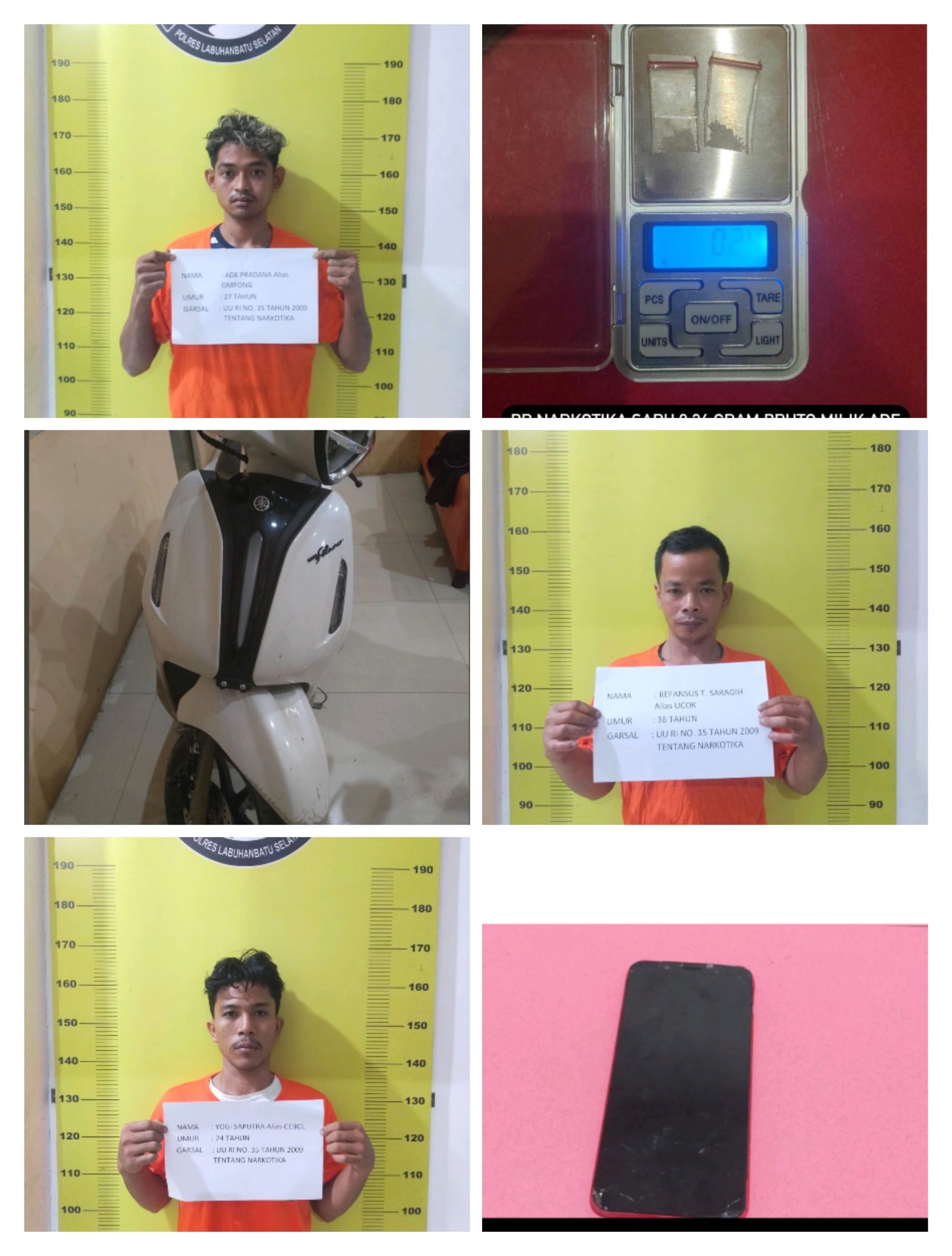 Kata Maringan, awalnya dilakukan penangkapan terhadap Ade Pradana alias Ompong, di sakunya ditemukan 1 paket kecil plastik diduga berisi sabu seberat 0, 24 gram 1 handphone (HP), 1 sepeda motor Yamaha Filano putih tanpa plat.