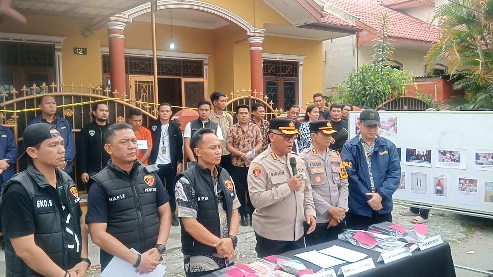 Kapolrestabes Medan Kombes Gidion Arif Setyawan didampingi Wakapolrestabes Medan AKBP Rudy Silaen dan Kasat Reskrim memaparkan pengungkapan kasus perampokan disertai pembunuhan.(ist).