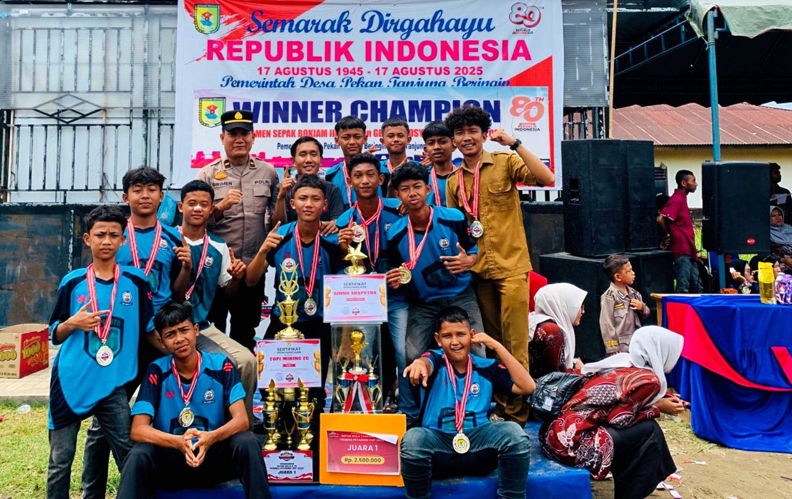 Manager tim Topi Miring FC, Dedi Pratama kopi 86 dan Rizki Aseng Maulana bersama seluruh pemenang turnamen mendapatkan hadiah trofi dan uang pembinaan. Kegiatan ini diharapkan menjadi agenda rutin setiap tahun, sebagai bentuk pembinaan generasi muda dan memperkuat rasa kebersamaan antar masyarakat di Kecamatan Tanjung Beringin.***