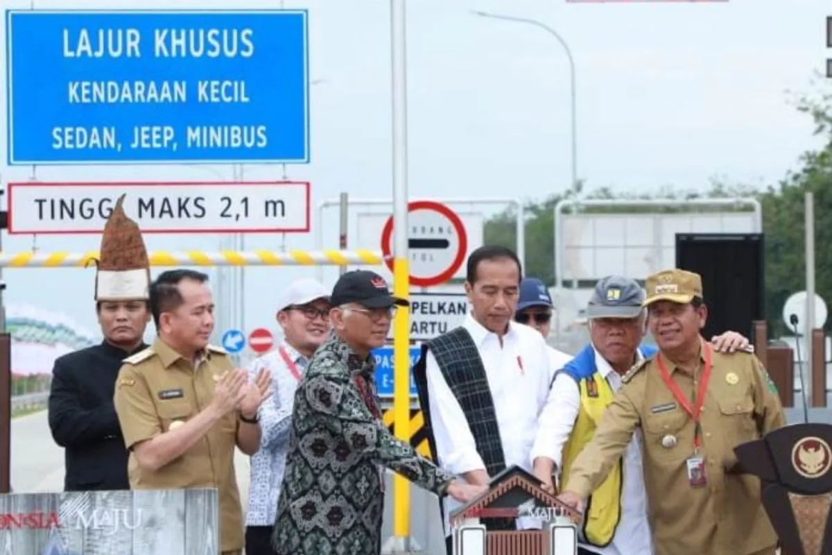 Presiden RI ir Joko Widodo menekan tombol tanda peresmian jalan tol Trans- Sumatera yang difokuskan di pintu Tol Sinaksak, Kab Simalungun, Selasa (10/9/24).