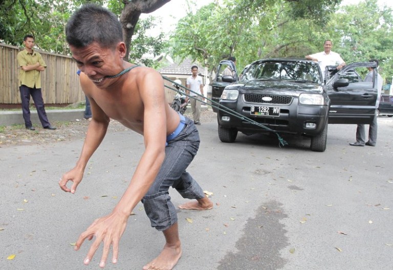 Sebelum unjuk kemampuan, pria berbobot 50 kilogram dengan tinggi badan sekitar 165 cm itu terlihat berdoa. Sambil duduk bersila, dia menurunkan kedua tangannya sampai wajahnya menyentuh tanah. Tanpa mengenakan baju, ia lalu menggigit tali nilon yang sudah diikatkan di bagian depan mobil.