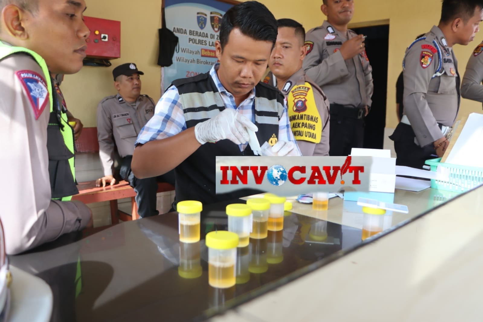 Propam Polda saat melakukan test urin terhadap personil Polres Labuhanbatu.(abi)