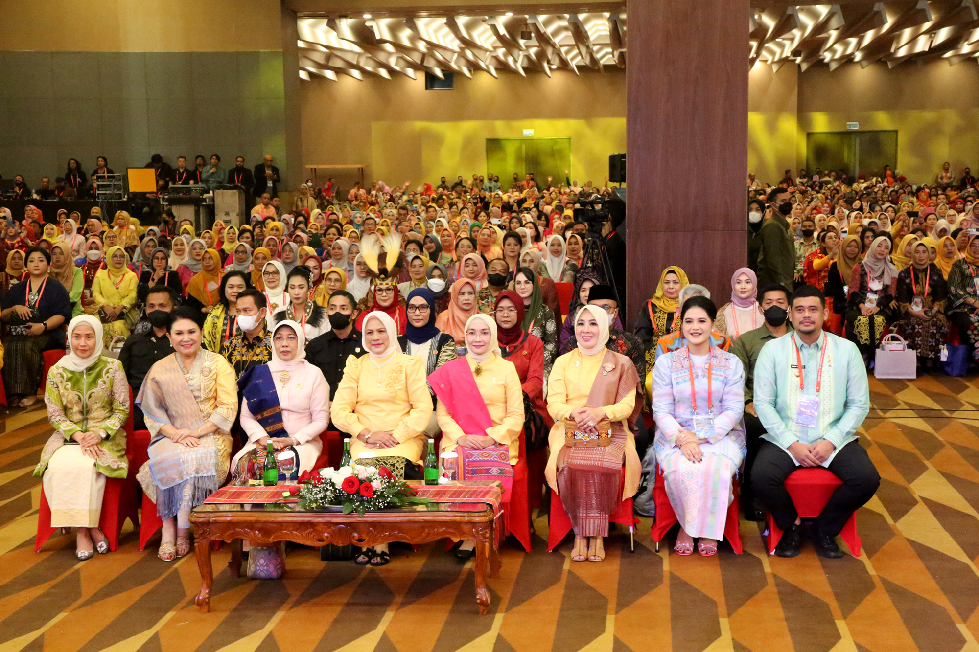 Wakil Ketua Dekranasda Sumut Sri Ayu Mihari mendampingi Ibu Negara Iriana Joko Widodo, serta Ketua Dekranas Wury Ma’ruf Amin, pada peringatan Hari Ulang Tahun Ke-43 Dekranas di Santika Dyandra Hotel Medan, Selasa (16/05).(ist).