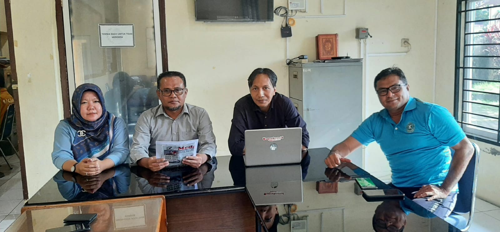 Ketua Panpel Sugiatmo didampingi Sekretaris Austin Tumengkol, Bendahara Marini Rizka Handayani, dan Sie Acara David Swayana usai rapat panitia di kantor PWI Sumut, Selasa (31/10).