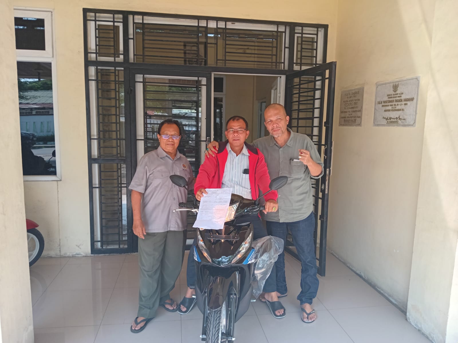 Sekjen PWI Sumut Hamonangan SR Panggabean menyerahkan sepeda motor hadiah utama sumbangan Kapoldasu kepada Josmarlin Tambunan (Medan Pos) di kantor PWI Sumut, Senin (30/6). (ist).