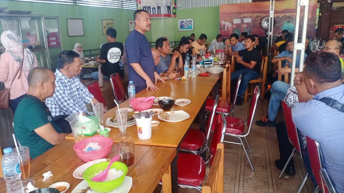 Ketua PWI Sumut Farianda Putra Sinik memberikan semangat kepada kontingen Porwanas XIV Banjarmasin, Kalsel pada jamuan makan siang, Minggu (25/8).