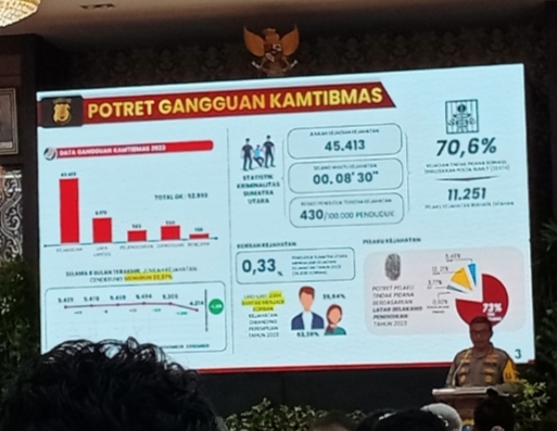 MEDAN, INVOCAVIT.COM- Angka kejahatan di Sumatera Utara sepanjang Tahun 2023 masih cukup tinggi. Pada Tahun 2023 Polda Sumut dan jajaran telah menerima laporan pengaduan sebanyak 45.413 laporan.