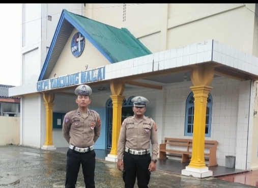 Personel Lantas Polres Tanjungbalai tampak sedang berjaga jaga di salah satu Rumah Ibadah.(ist)