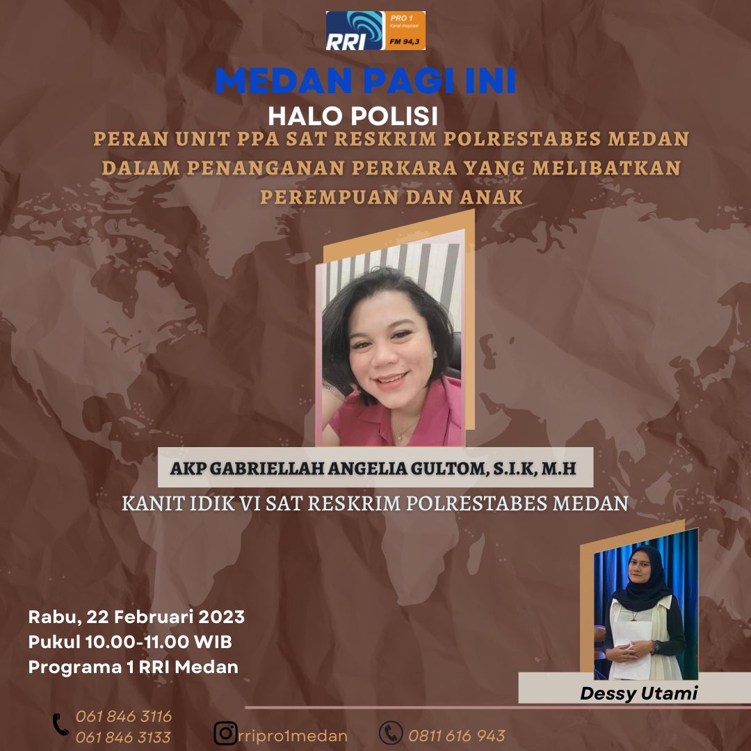Hal itu dikatakan Kanit VI Satreskrim Polrestabes Medan AKP Gabriellah Angelia Gultom, SIK, M. H dalam acara Dialog interaktif Halo Polisi Poldasu dengan topik : Peran Unit PPA Sat Reskrim Polrestabes Medan dalam penanganan perkara melibatkan Perempuan dan Anak,” pada Rabu, 22 Februari 2023, sekitar pukul 10.00 WIB di RRI Medan.