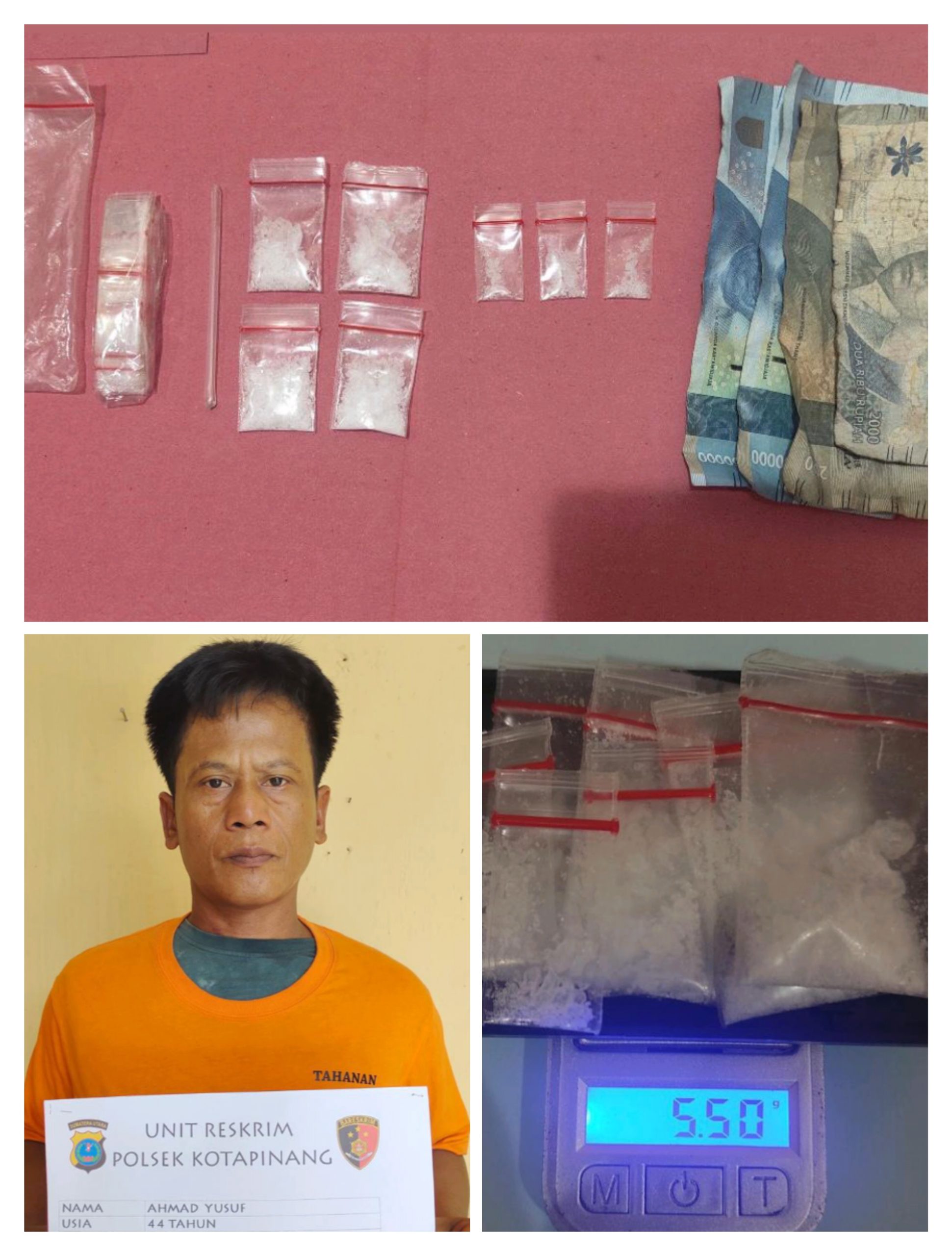 Dari penggeledahan di badan tersangka ditemukan 7 paket sabu seberat 5,50 gram, plastik klip kosong, pipet, timbangan dan uang tunai Rp 204.000,- diduga hasil penjualan sabu.