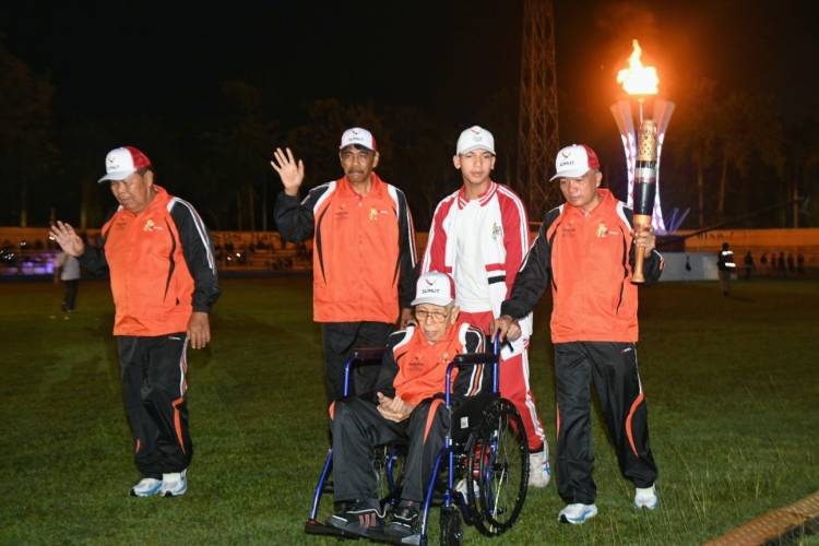 Salah satu kontingen saat defile sambil membawa obor Api PON XXI Aceh-Sumut saat pembukaan di Stadion Baharuddin Siregar, Lubuk Pakam, Deliserdang , Senin Malam (9/9/2024).