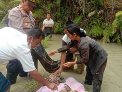 Petugas gabungan bersama warga membantu melakukan evakuasi korban yang jatuh di jembatan