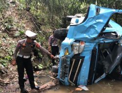 Polisi Lalulintas sedang melakukan penyelidikan dan olah TKP dilokasi bus masuk jurang