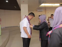 Ketua DPC KPPI Ely Juliaty saat mengenakan ulos kepada Kesbang Linmas Arjuna