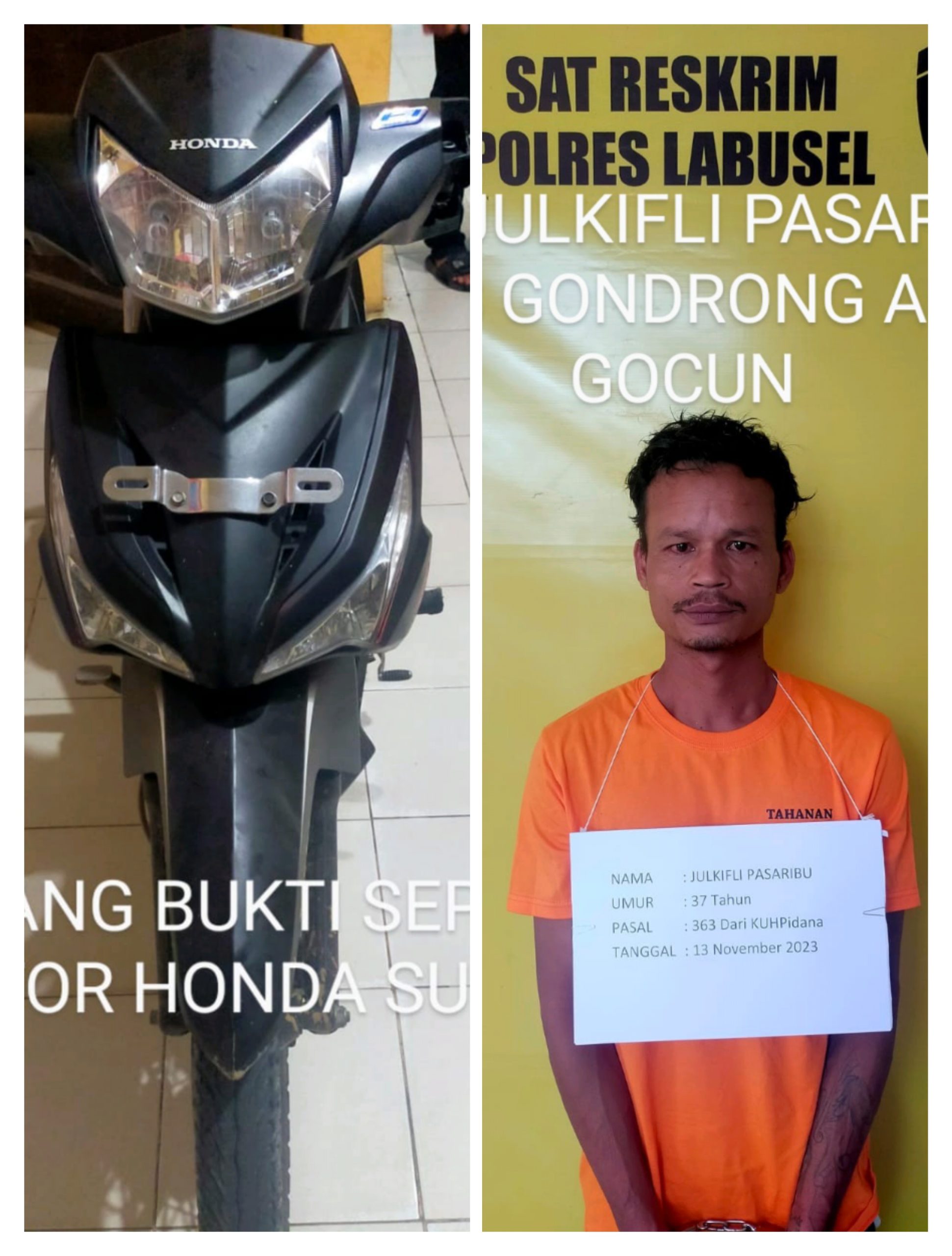 “Tersangka menggondol sepeda motor Supra X 125 milik korban Utari Wulan Dari (21), warga Dusun Sri II, Desa Pematang Seleng, Bilah Hulu, Kabupaten Labuhanbatu,” jelas Maringan, Selasa (14/11/2023).