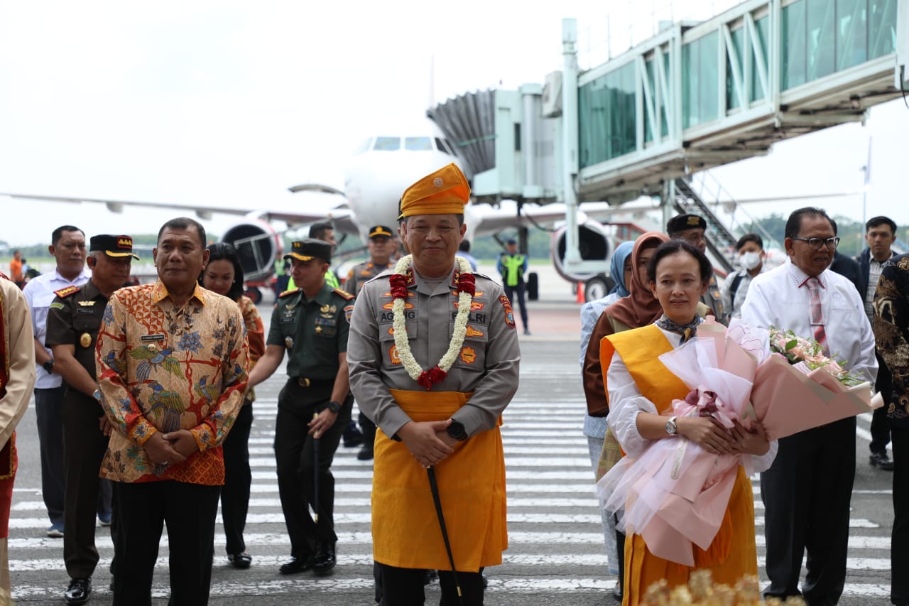 Pimpinan tertinggi di Polda Sumut itu datang bersama istri yang merupakan Ketua PD Bhayangkari Sumut. Tiba di Bandara KNIA langsung dikalungi bunga dan pakaian khas melayu.