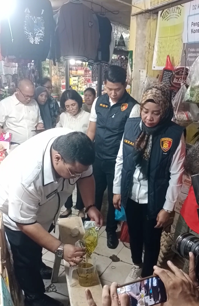 Charles TH Situmorang dari Disperindag disaksikan Kanit AKP Indah Handayani menuangkan MinyaKita ke teko takaran untuk memastikan ada tidaknya pengurangan takaran di Pasar Peringgan depan toko QQ, Rabu (12/3/2025).(jos tambunan).