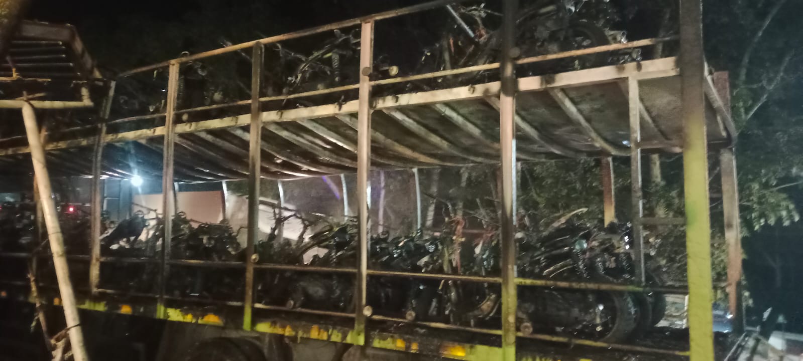Api kemudian dengan cepat menjilati sekelilingnya sehingga 44 unit sepeda motor jenis Honda Vario dan 2 Beat ludes bersama truk tersebut.