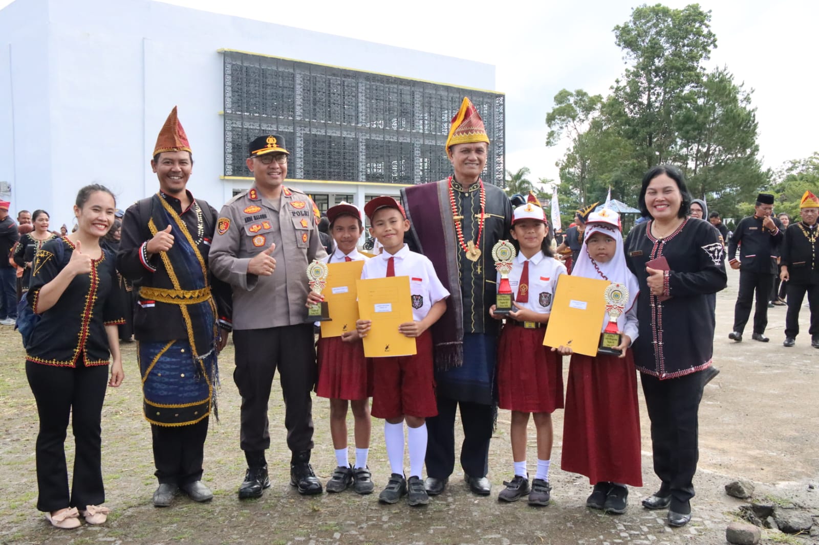 Kapolres Pakpak Bharat AKBP Pebriandi Haloho bersama Wakil Bupati H. Mutsyuhito Solin DR. M.Pd, poto bersama dengan para siswa-siswi pemenang perlombaan pada upacara Hardiknas 2025, Jumat (2/5).(ist).