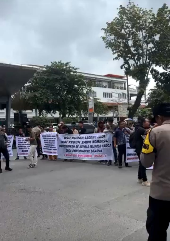 Mengklaim sebagai wakil masyarakat Desa Poncowarno di Kabupaten Langkat, puluhan warga menggelar unjuk rasa di kampus USU (Universitas Sumatera Utara), Medan, siang tadi (15/12/2025).